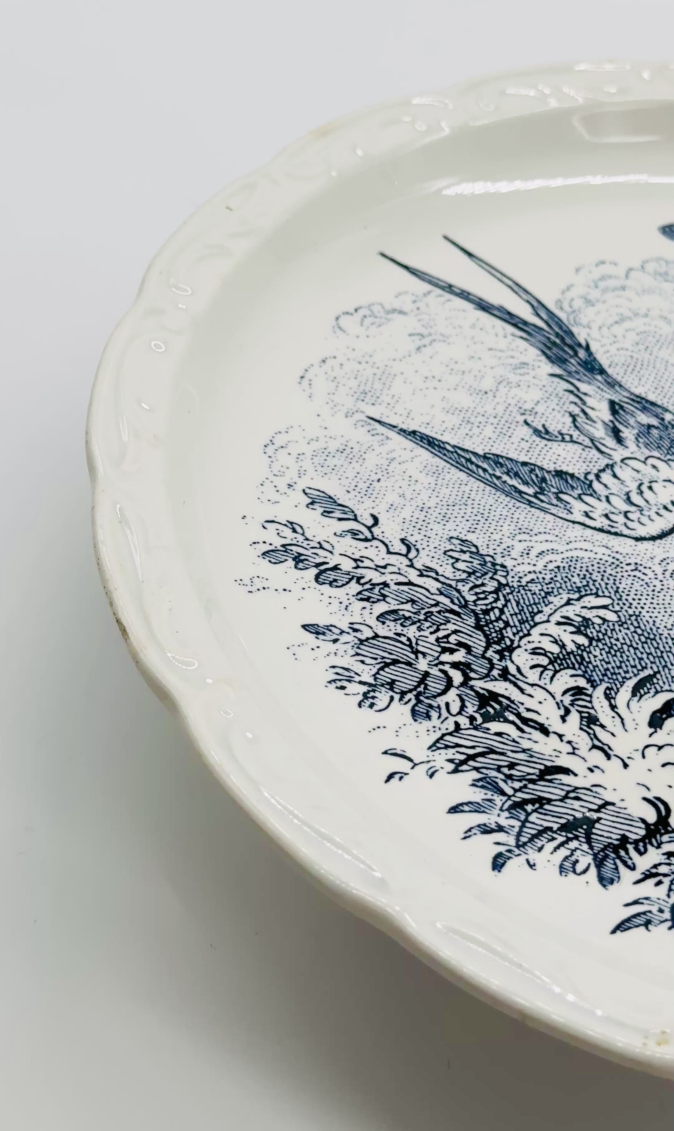 Assiette décorative en faïence française, ornée d’un décor central bleu représentant un oiseau en vol dans un paysage végétal, traité dans un style illustratif fin et détaillé. L’aile présente un relief moulé discret, apportant du caractère à la forme tout en restant sobre.