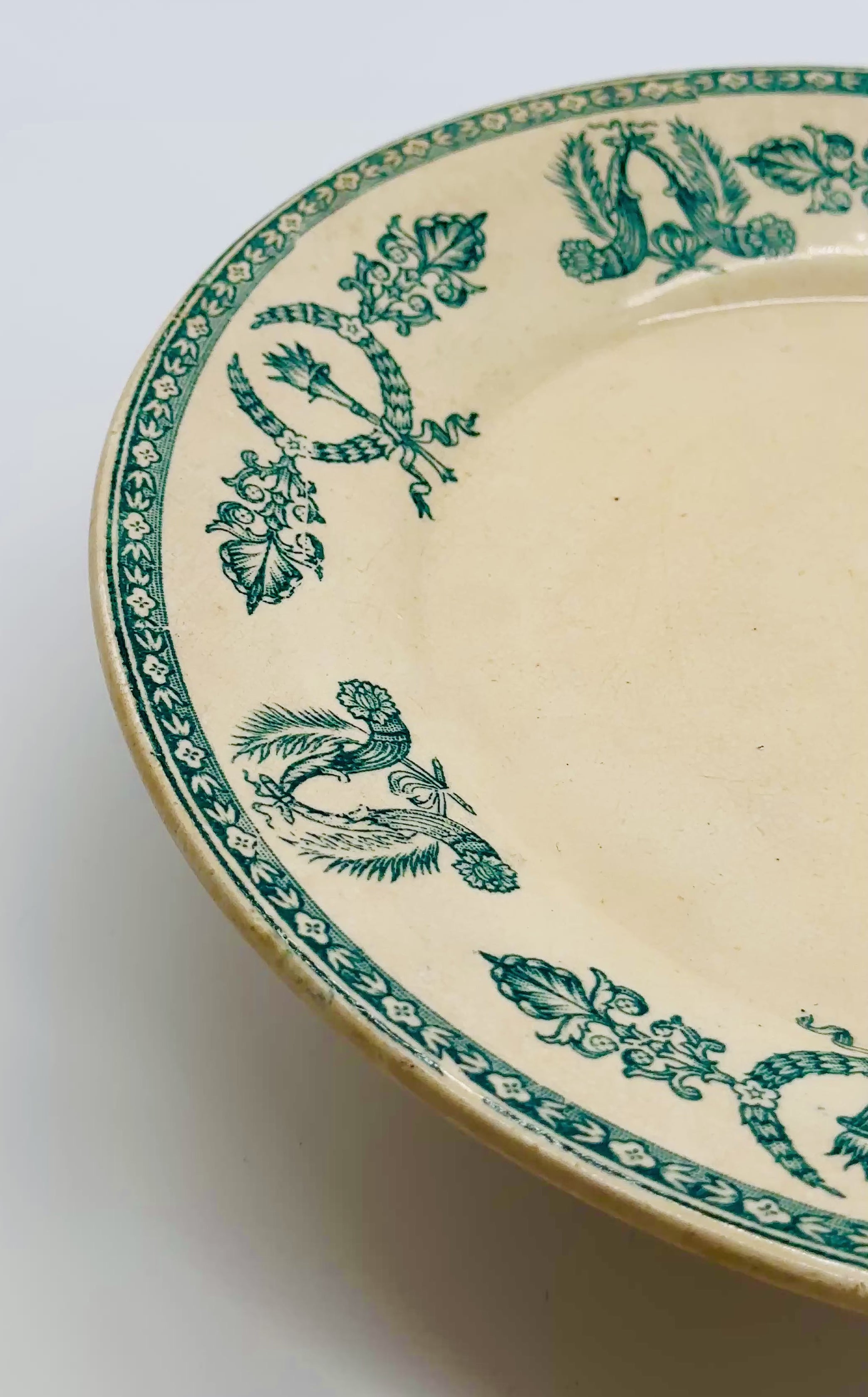 La pièce présente un décor vert appliqué sur l’aile, composé de motifs végétaux et symboliques disposés en frise régulière. Le centre, volontairement dégagé, met en valeur la teinte chaude et nuancée de la faïence, accentuée par une patine ancienne homogène. L’ensemble offre une lecture décorative équilibrée et sobre, typique des arts de la table anciens.