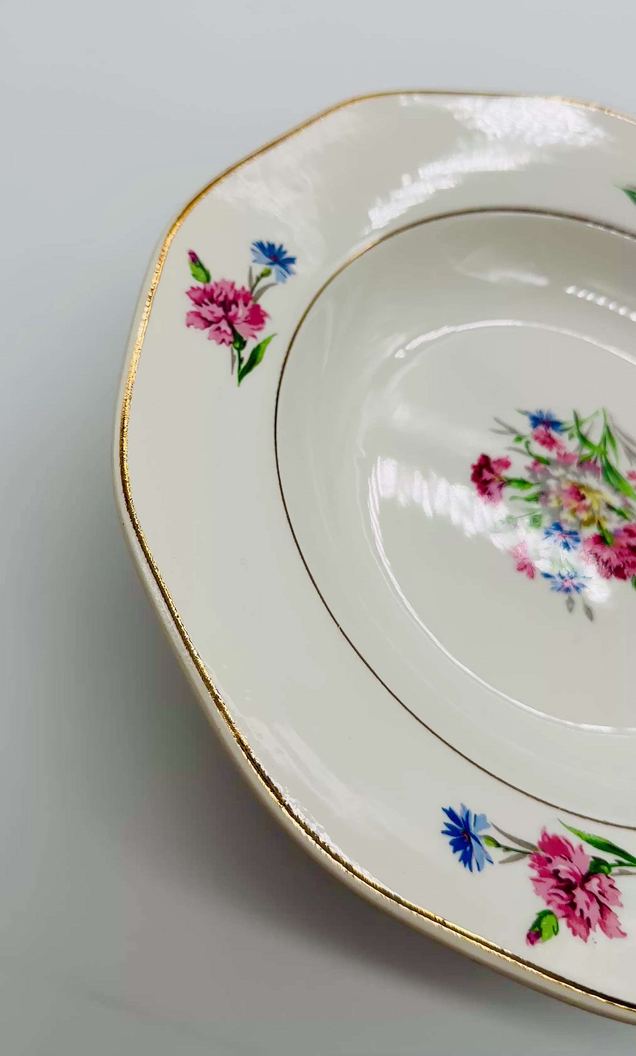 Le décor floral, d’inspiration classique, évoque les tables soignées et les intérieurs bourgeois de la Belle Époque.
