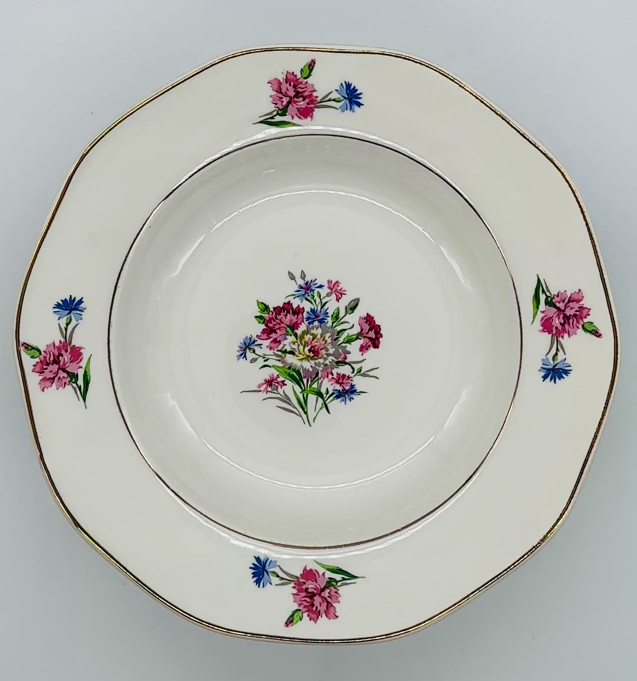 Assiette creuse en faïence fine à décor floral polychrome, bouquet central peint, bord contourné et filet doré